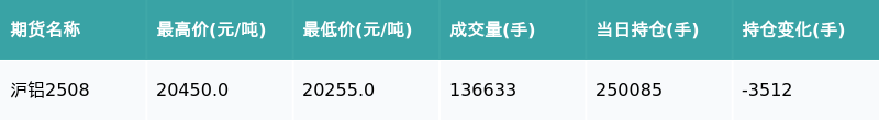 南财智讯6月24日电金牛网,南财金融终端盘后期货数据显示,上海期货交易所的沪铝主力合约收跌0.51%,收盘报20315.0元/吨,日内资金流出7562.35万元。其他相关指标见下表: