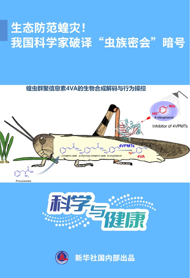 “作为4VA生物合成的关键酶,我们发现4VPMTs也是抑制蝗虫聚集的重要靶点。”中国科学院动物研究所郭晓娇副研究员说,在此基础上,借助植物中普遍含有的4-硝基苯酚,与4VPMTs的特异性相互作用,从而抑制4VA生物合成,阻止蝗虫聚集。
