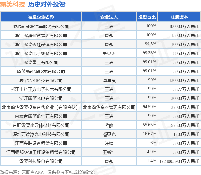 本站消息,根据天眼查APP显示,露笑科技(002617)新增一起对外投资事件,被投资公司为露笑科技股份有限公司,法定代表人鲁永恒运资本,投资占比为1.4%。该公司从事电气机械和器材制造业,注册资本为192300.5903万人民币。目前,露笑科技共存在对外投资16项恒运资本,详见下表:
