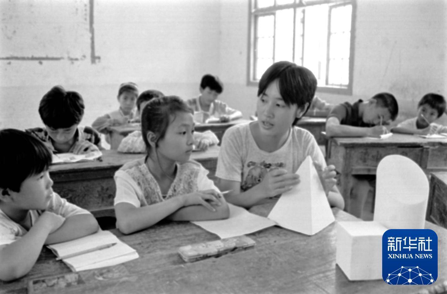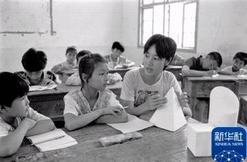 1997年,上饶师专九六级美术系的学生在给江西省铅山县太源畲族乡小学生上素描课。新华社记者 宋振平 摄
