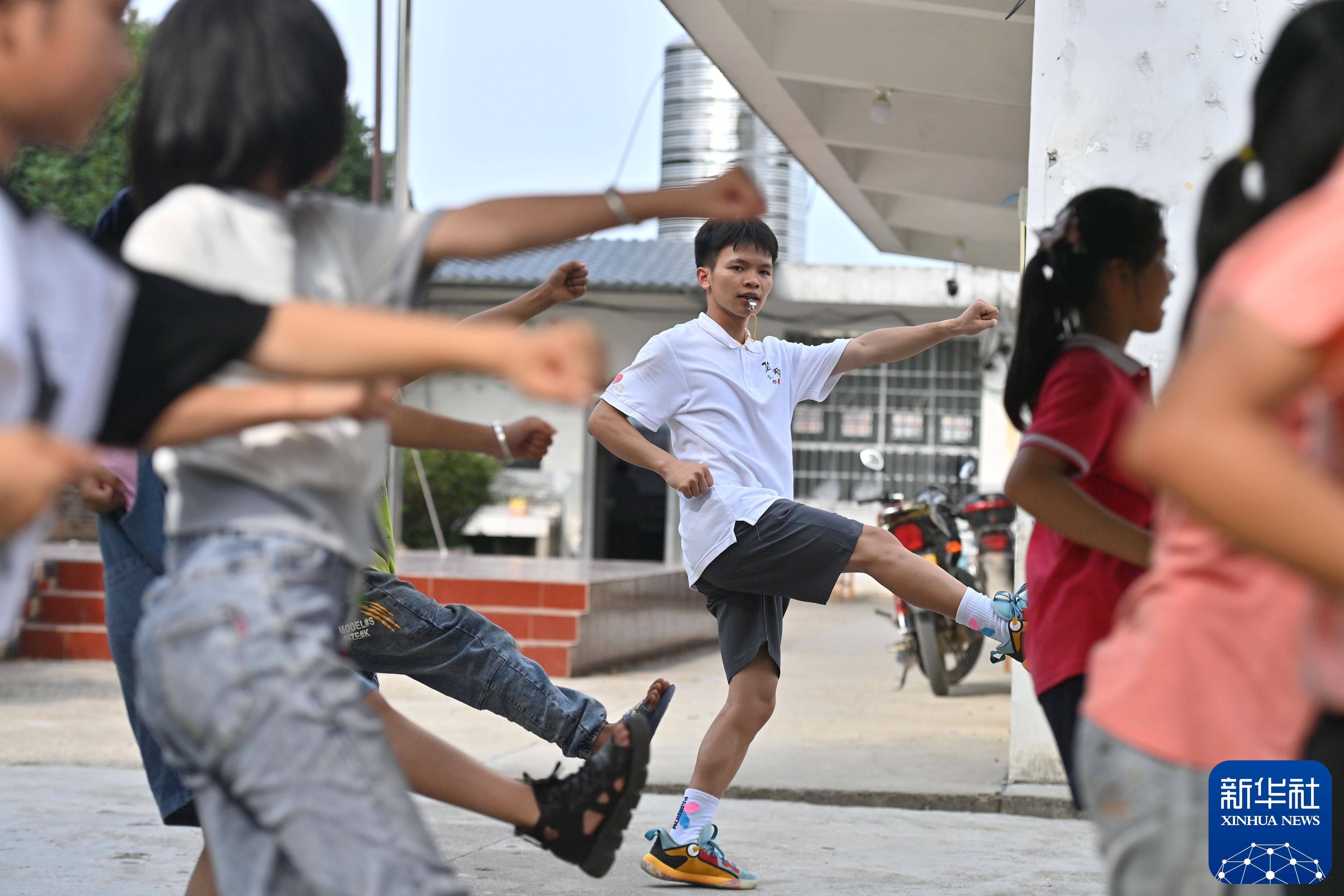 在广西三江侗族自治县独峒镇知了小学,南通大学学生全少贤教孩子们学习武术(2023年7月14日摄)。新华社记者 黄孝邦 摄