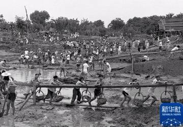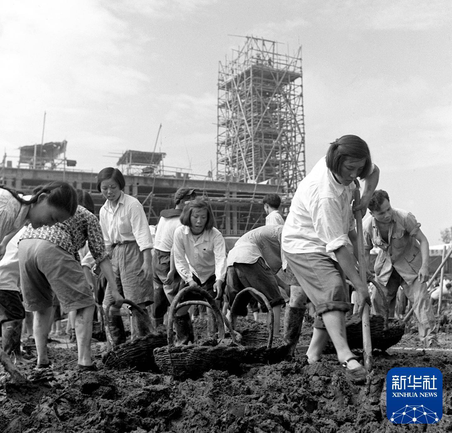 1958年,中国人民大学学生在校园内修建人工湖。新华社发