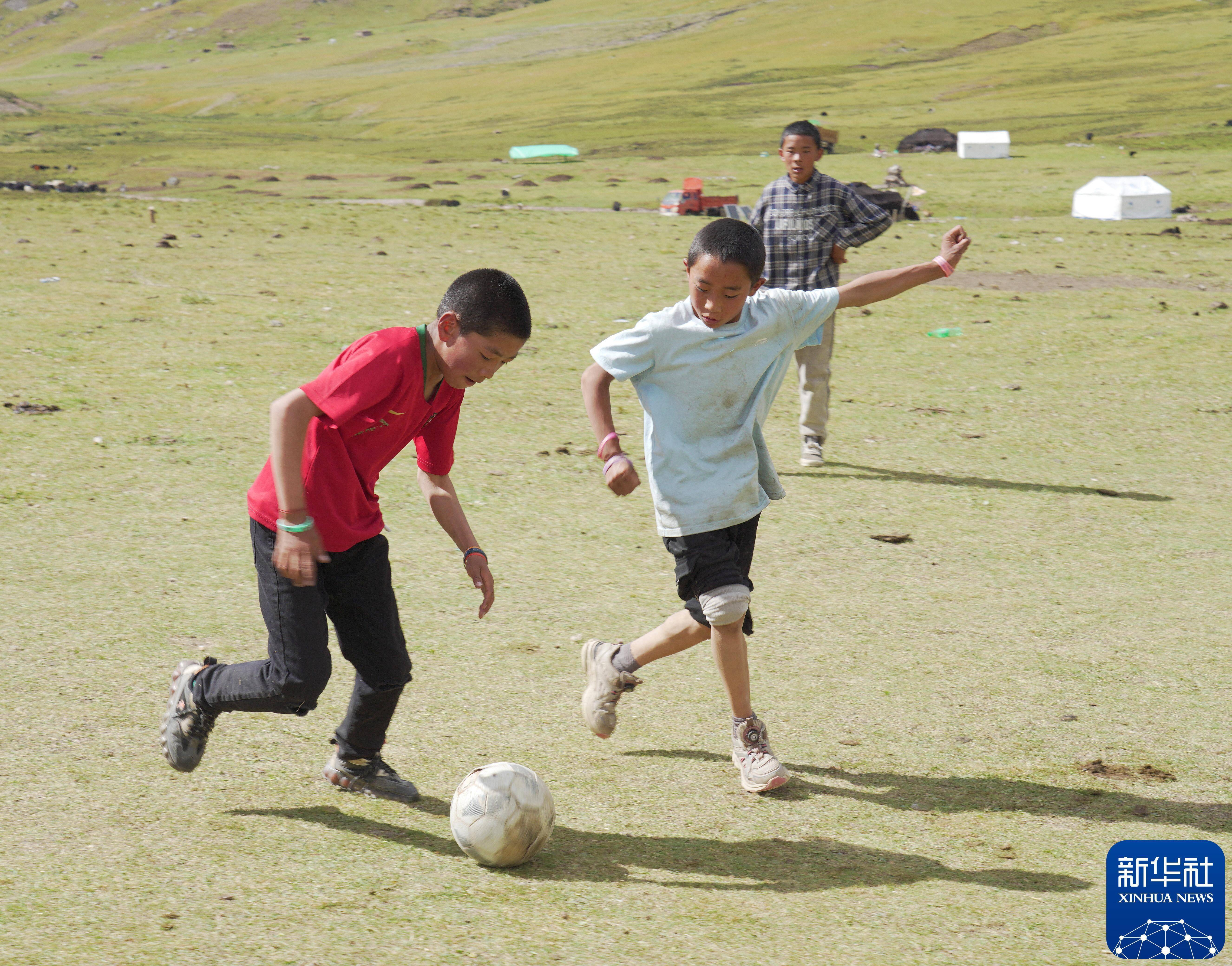 2024年8月23日,在青海省玉树藏族自治州囊谦县白扎乡巴麦村的夏季草场,孩子们在踢足球。新华社记者 柳泽兴 摄暑假已来