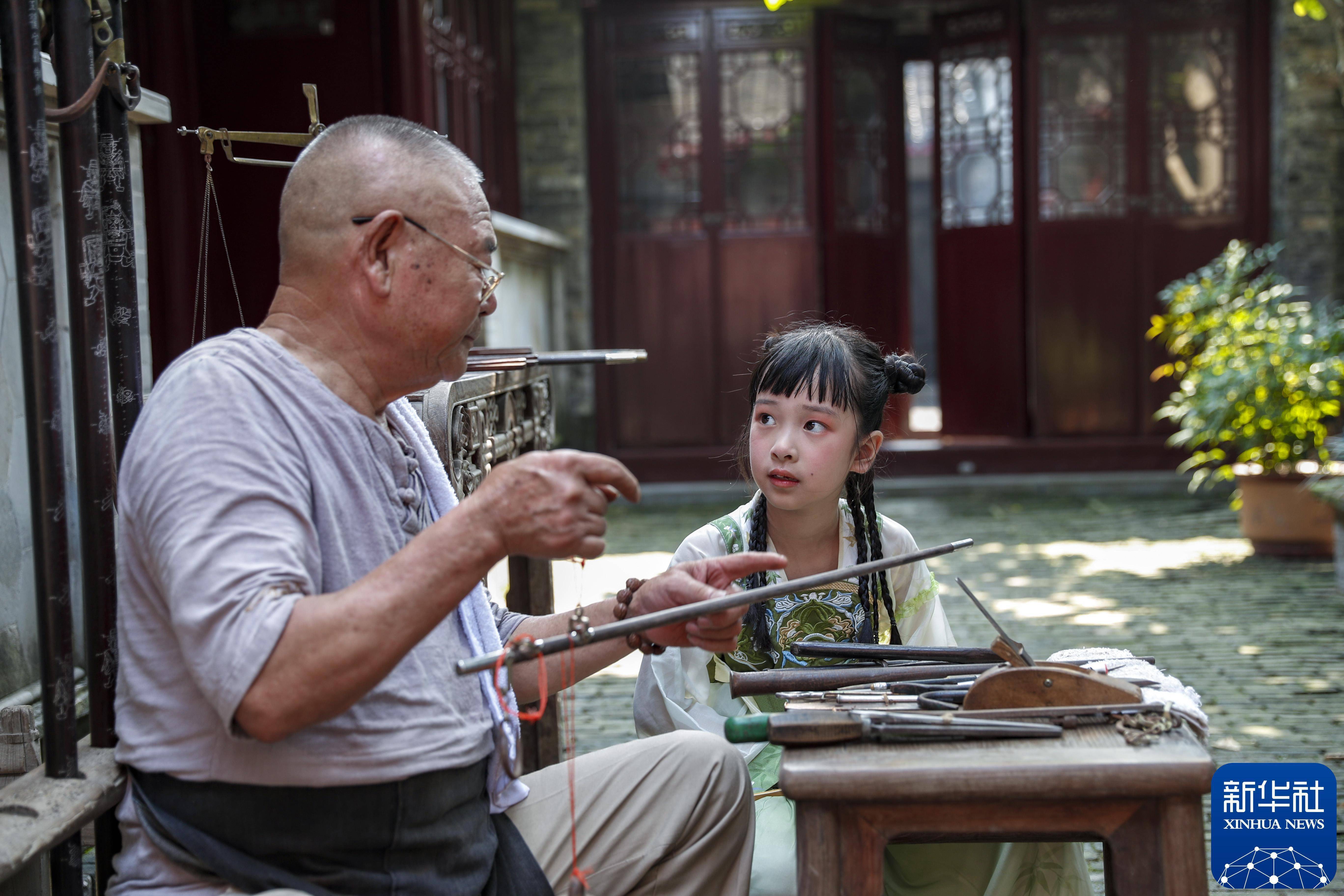 2024年8月24日,在江苏省兴化市昭阳街道成氏宅第,小朋友在观看非遗传承人制作木杆秤。新华社发(周社根 摄)参与社会实践活动