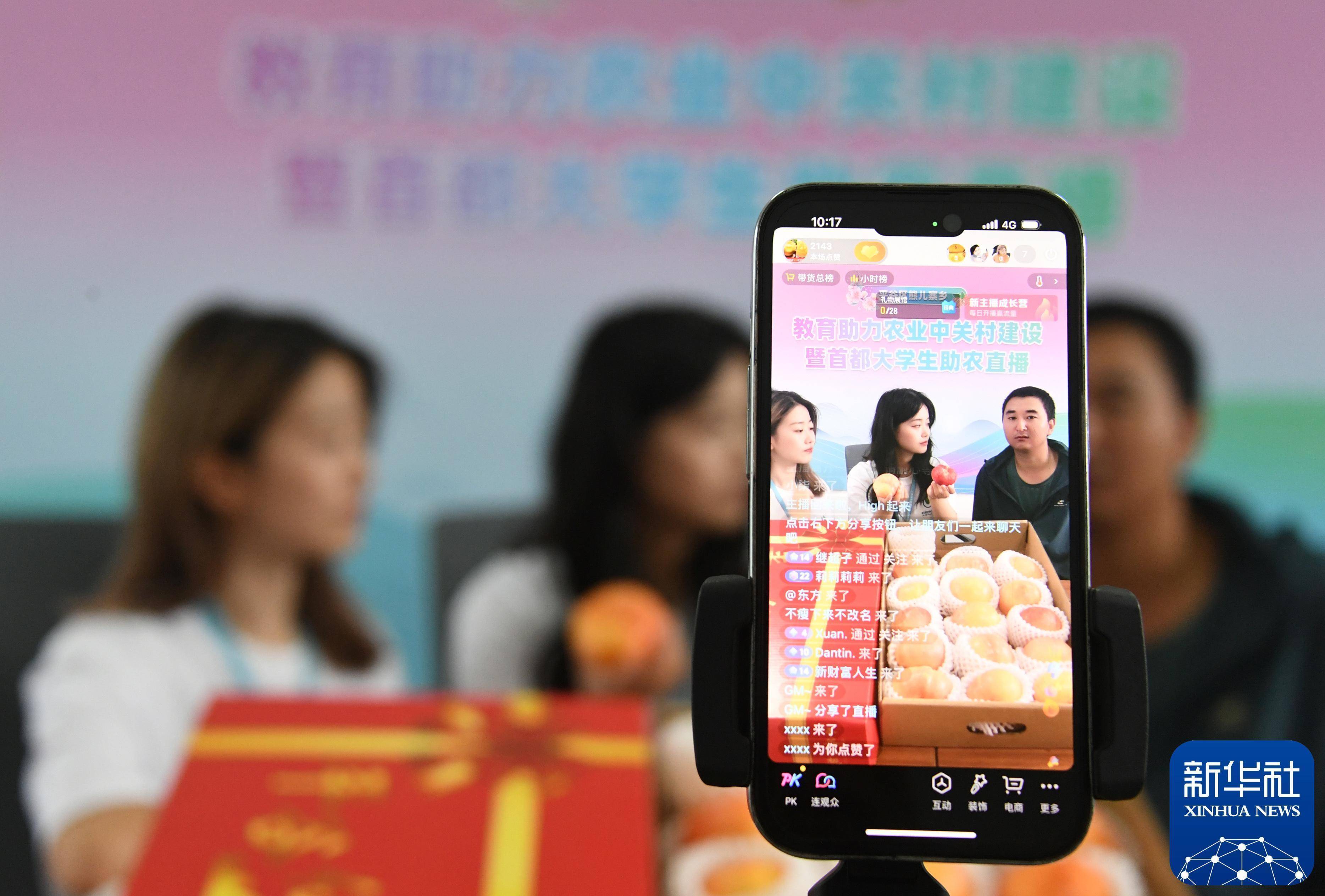 2024年7月12日,在北京市平谷区熊儿寨乡熊儿寨村,中国传媒大学学生与桃农一起直播销售桃子。新华社记者 任超 摄在广阔天地间