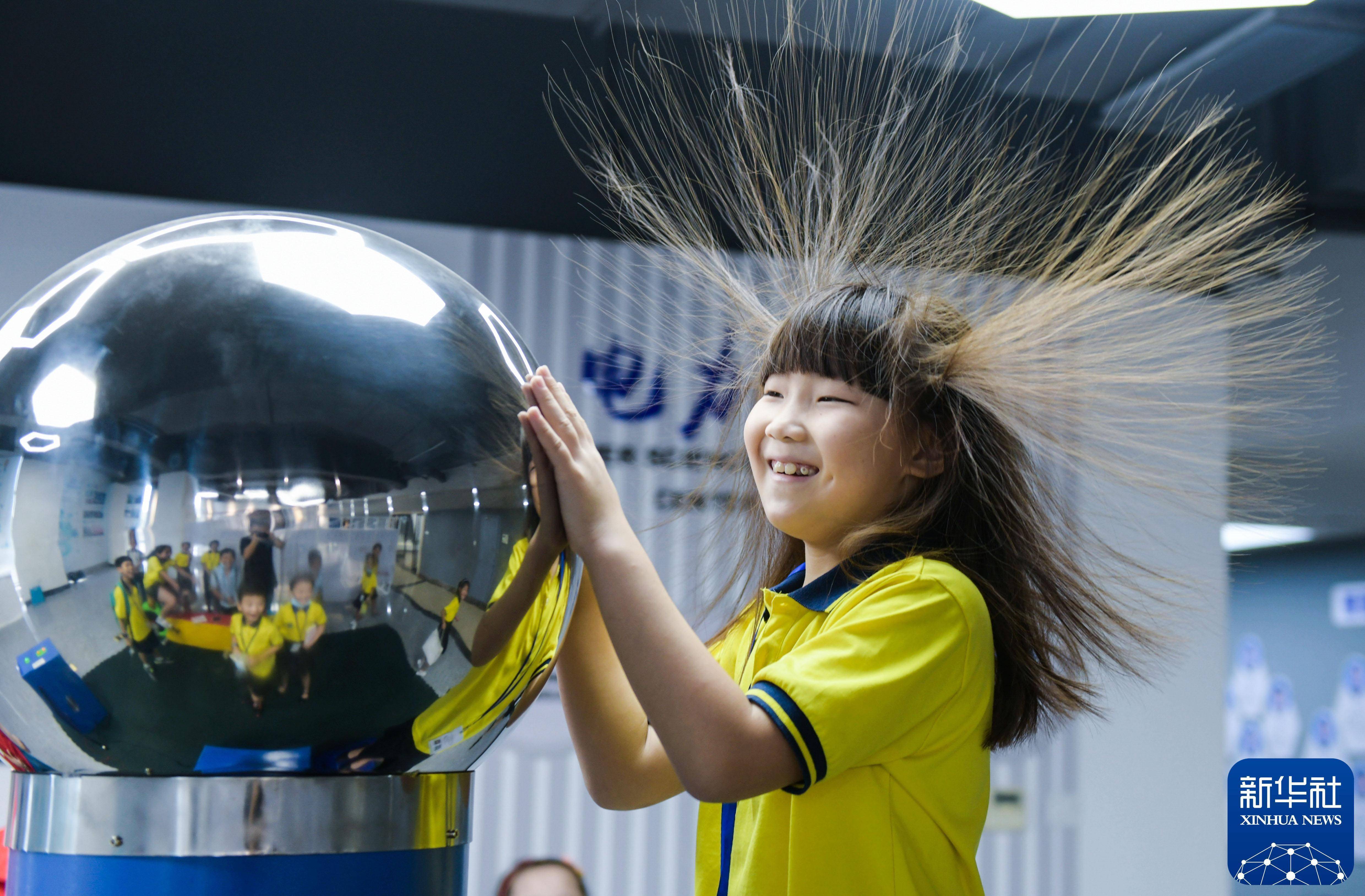 2020年8月14日,在浙江省余姚新时代文明实践基地内的科普中心,小朋友在体验静电发生器。新华社记者 徐昱 摄暑期是一段令人难忘的快乐时光