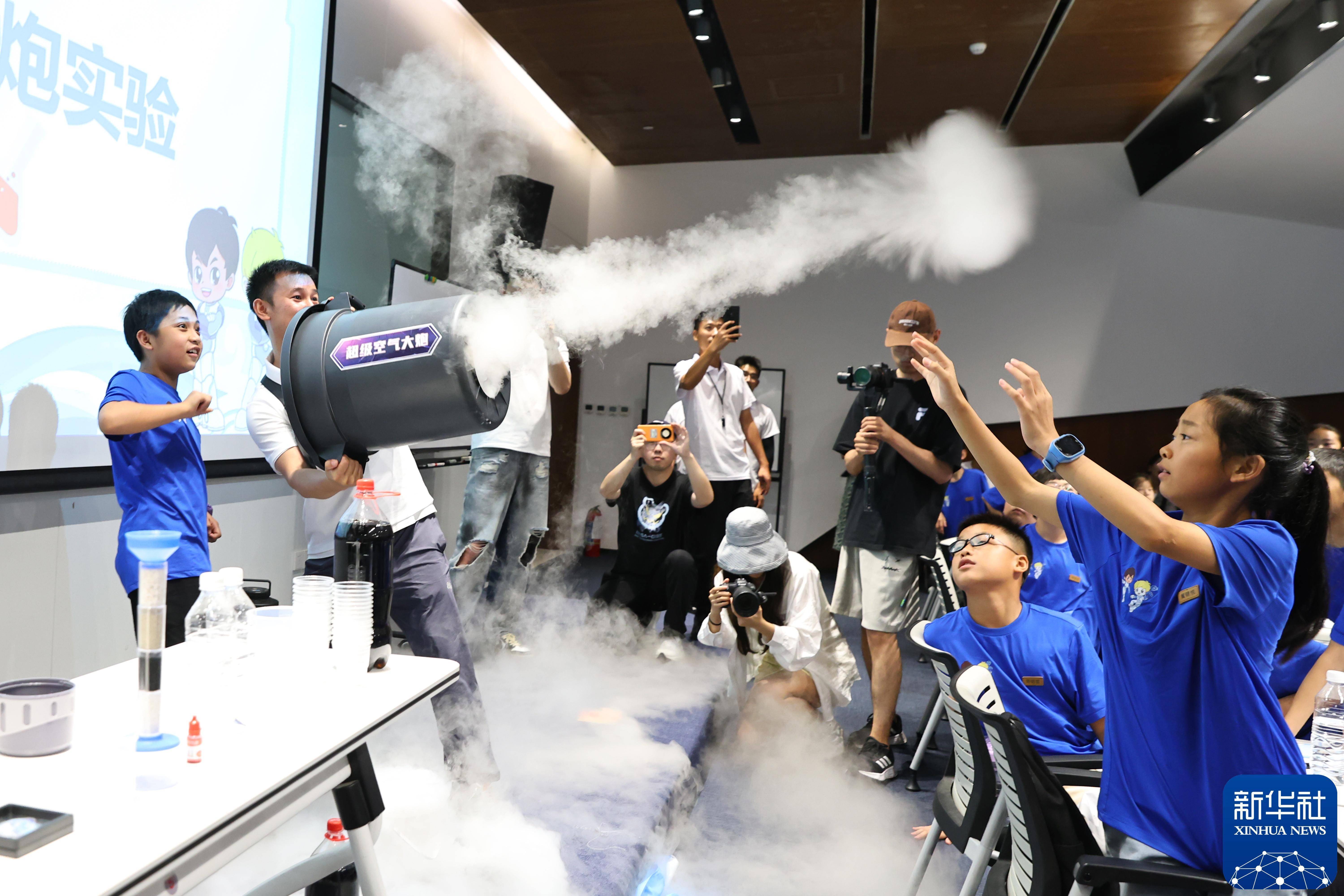 2024年7月28日,孩子们在科技夏令营中体验空气炮实验。新华社发(王海滨 摄)