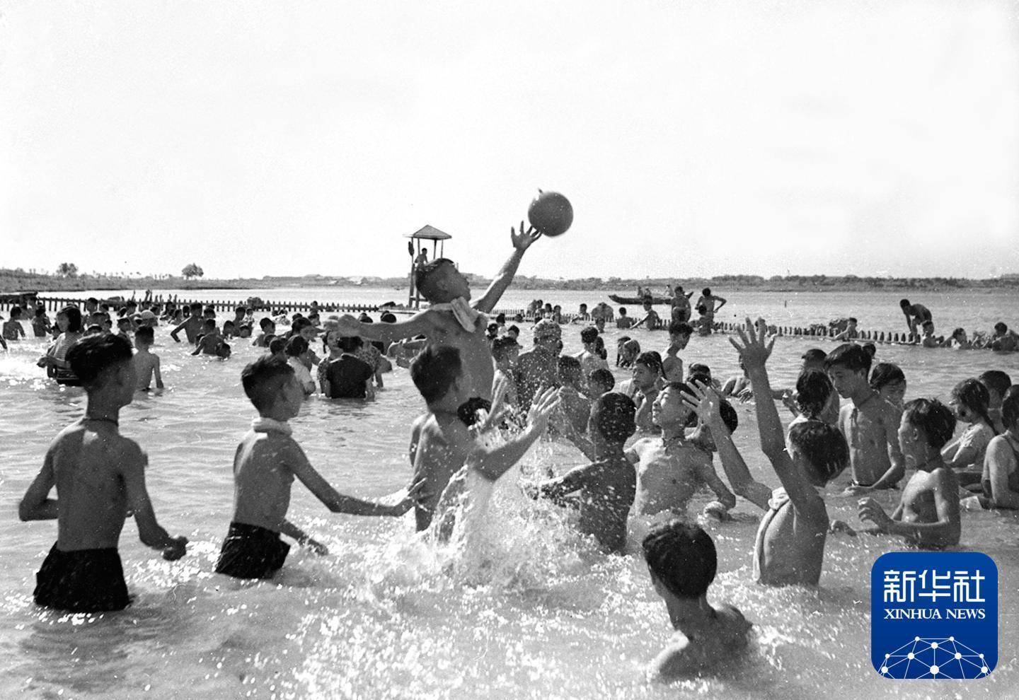 1956年7月26日,在湖北省武汉市少年先锋队队员夏令营中,孩子们在东湖游泳场做抢水球的游戏。新华社发