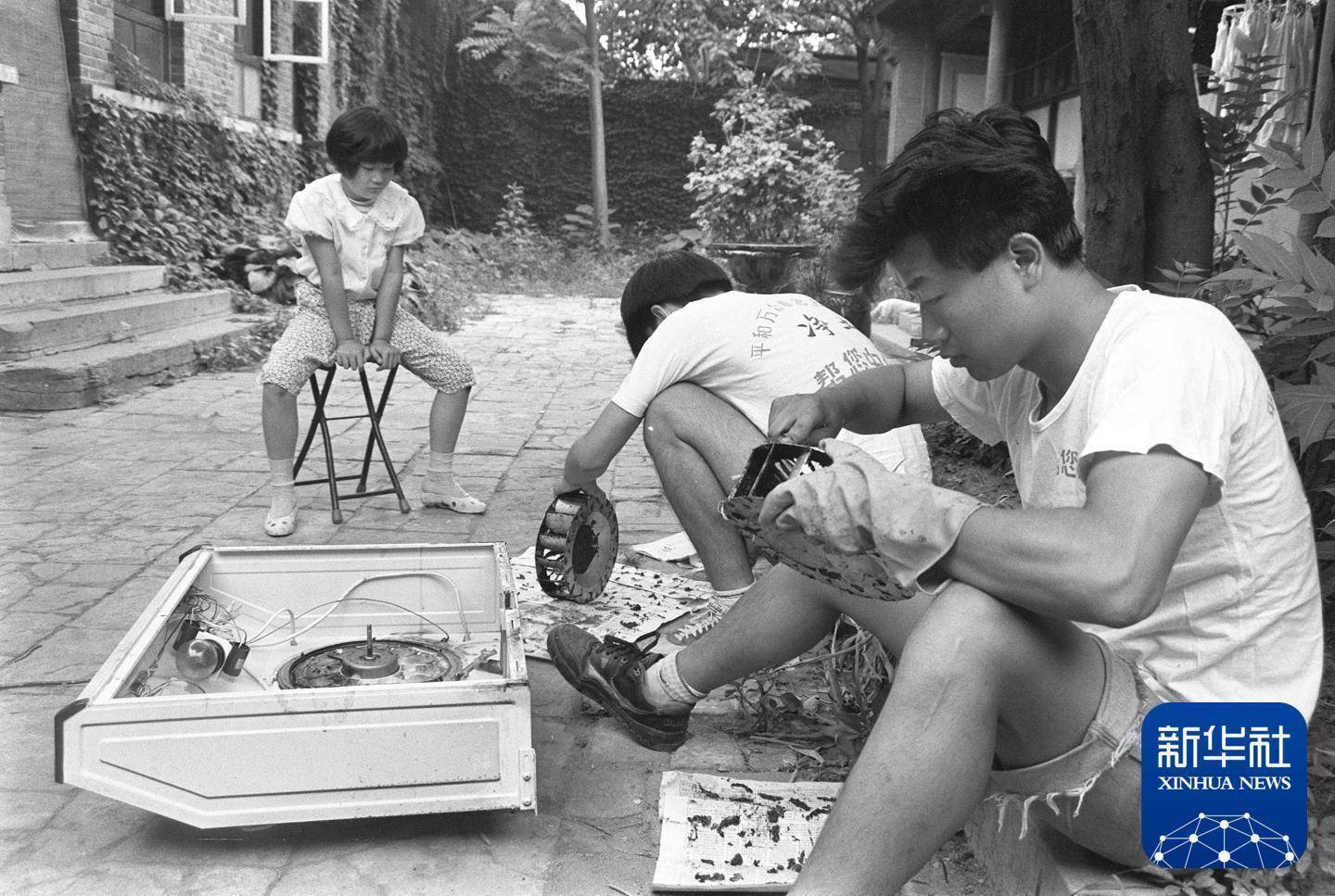 1992年,大学生在北京为客户清理抽油烟机。新华社发(钟鹏驰 摄)他们利用暑期时间