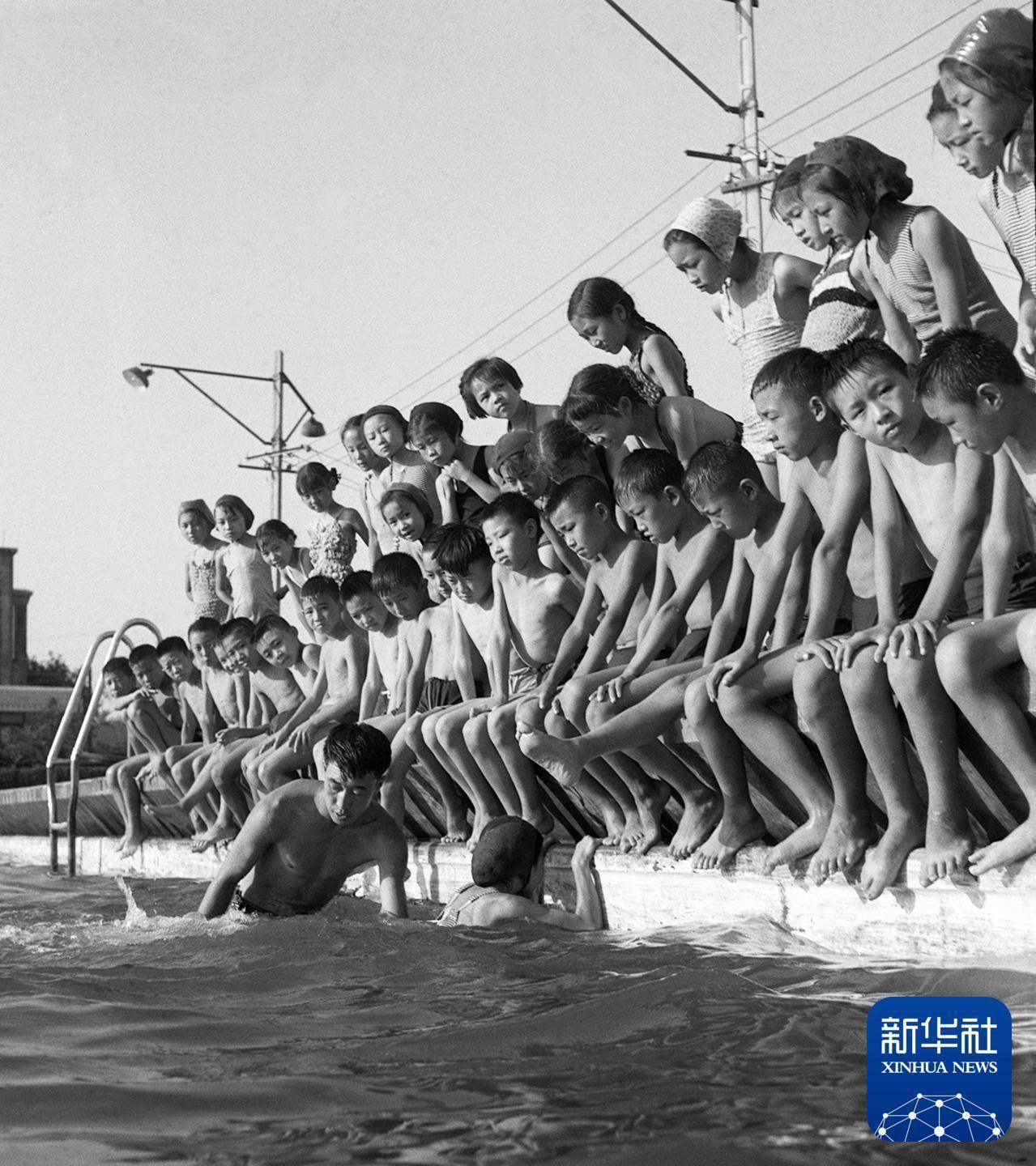 1961年,游泳训练班的孩子们在教练员帮助下学游泳。 新华社记者 孙永盛 摄