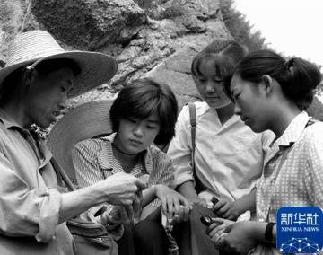 1979年,北京市中学生地质夏令营的同学在十三陵山区学习辨认岩石标本。新华社记者 韩晓华 摄