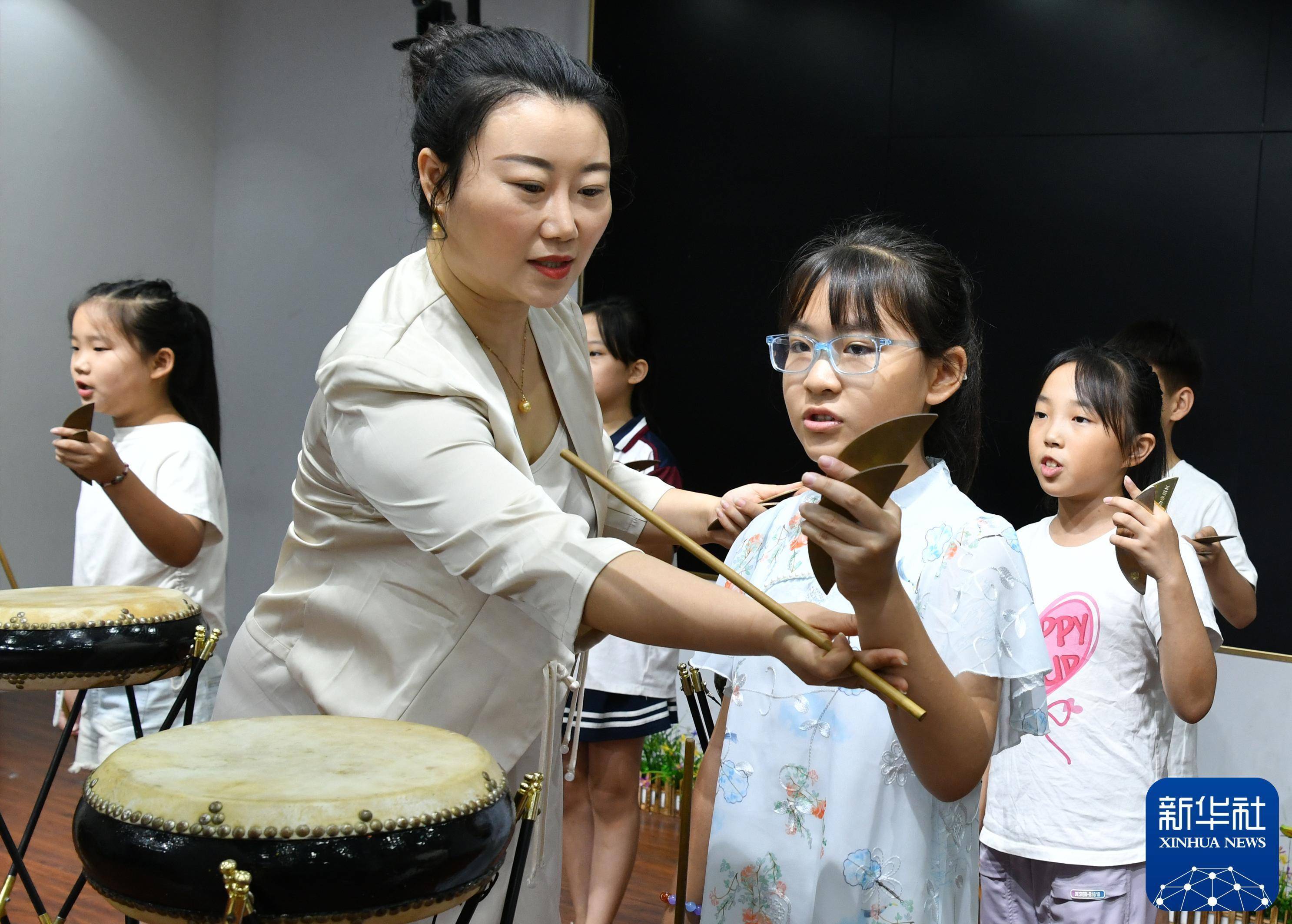 2024年7月26日,在河间市第一实验小学,西河大鼓艺人指导学生学习西河大鼓。新华社记者 牟宇 摄
