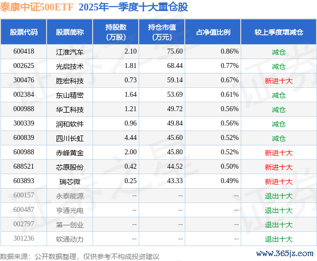 从基金规模来看,泰康中证500ETF基金2025年一季度公布的基金规模为0.88亿元,较上一期规模9386.99万元变化了-547.92万元,环比变化了-5.84%。该基金最新一期资产配置为:股票占净值比97.27%,无债券类资产,现金占净值比2.48%。从基金持仓来看,该基金当季前十大股票仓位达6.06%,第一大重仓股为江淮汽车(600418),持仓占比为0.86%。