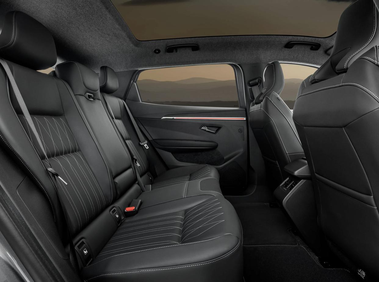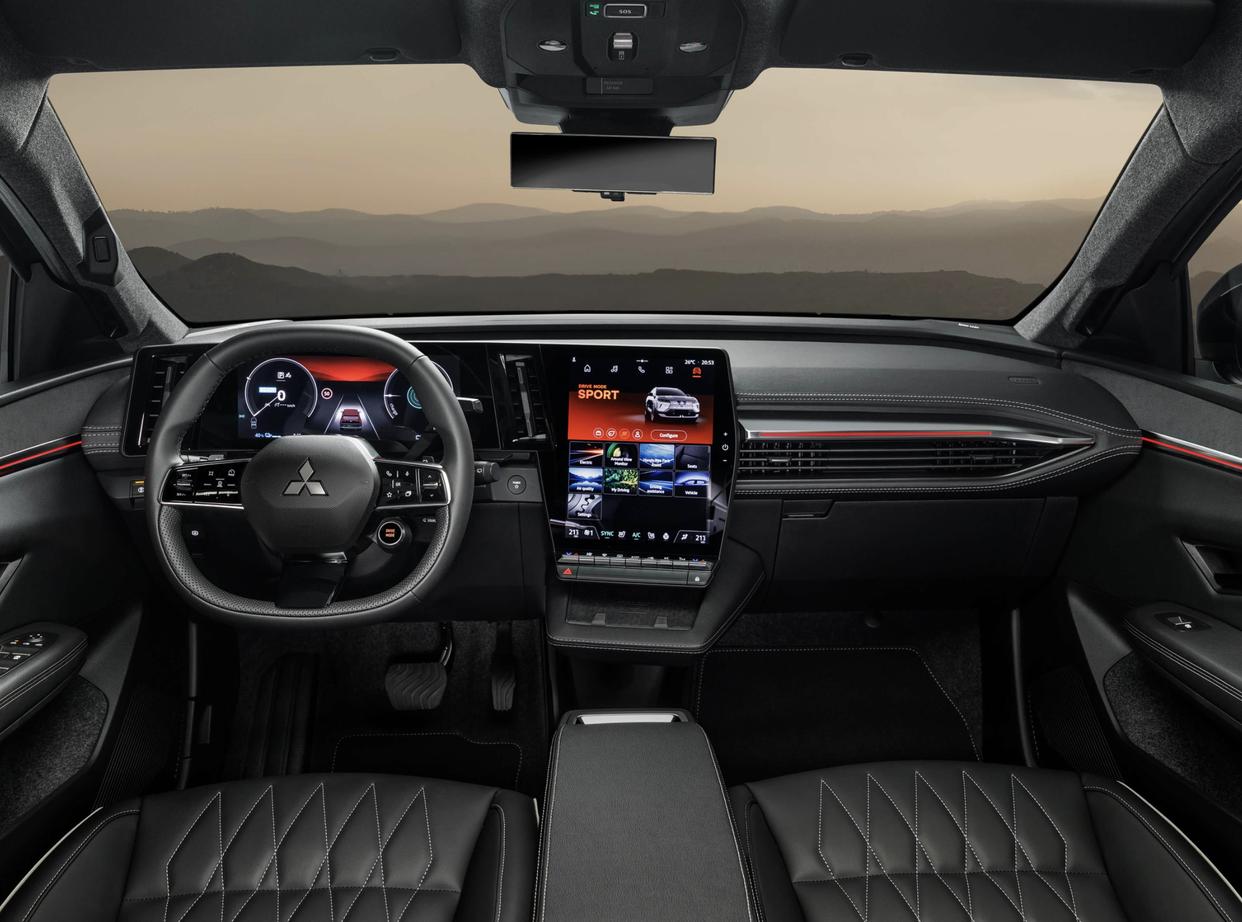 得益于车顶可变色的全景天窗和大尺寸侧窗的加持,车内的乘坐环境更加明亮,在大夏天也能隔绝更多的紫外线。肉眼可见的麂皮绒车顶面料铺陈,环抱式的座舱也加入了大量黑灰色超纤皮和哑光黑色软性材质的相互铺陈,还有精致的手工缝线工艺,银色金属材质,还配备了红色饰条的点缀、贯穿式空调出风口、环绕四周的多色氛围灯以及哈曼卡顿音响系统。科技感方面,全新三菱Eclipse Cross配备了12.3英寸液晶仪表以及12英寸纵向中控屏,支持时下主流的手机互联,科技感显得中规中矩。此外,它还配备了无钥匙进入/启动、一键启动、主/副驾驶安全气囊、前排侧气囊、前后排头部气帘、倒车影像、定速巡航、自动空调……