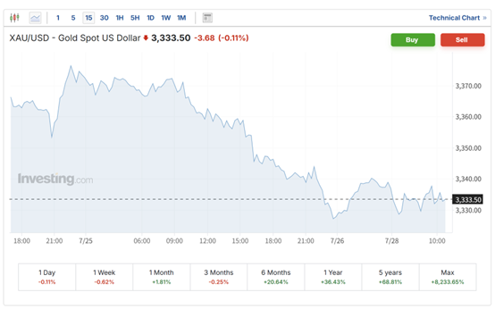 与此同时,黄金则小幅下跌,截至目前现货黄金跌0.11%,报3333.5美元每盎司,因美欧贸易协定削弱了投资者的避险需求。