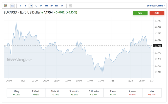 此外,欧元兑美元上涨0.1%,报1.1754美元。上周,受投资者对欧美达成贸易协议的乐观预期提振,欧元兑美元上涨了1%。