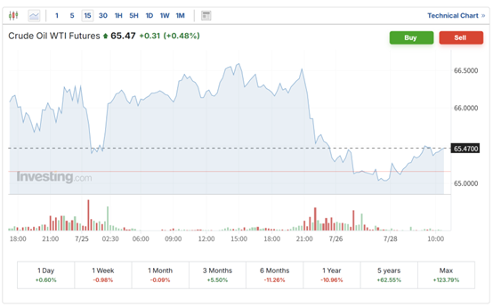 WTI原油上涨0.48%,报65.47美元每桶,因最新的贸易进展减轻了投资者对贸易战会限制全球经济活动并影响燃料需求的担忧。